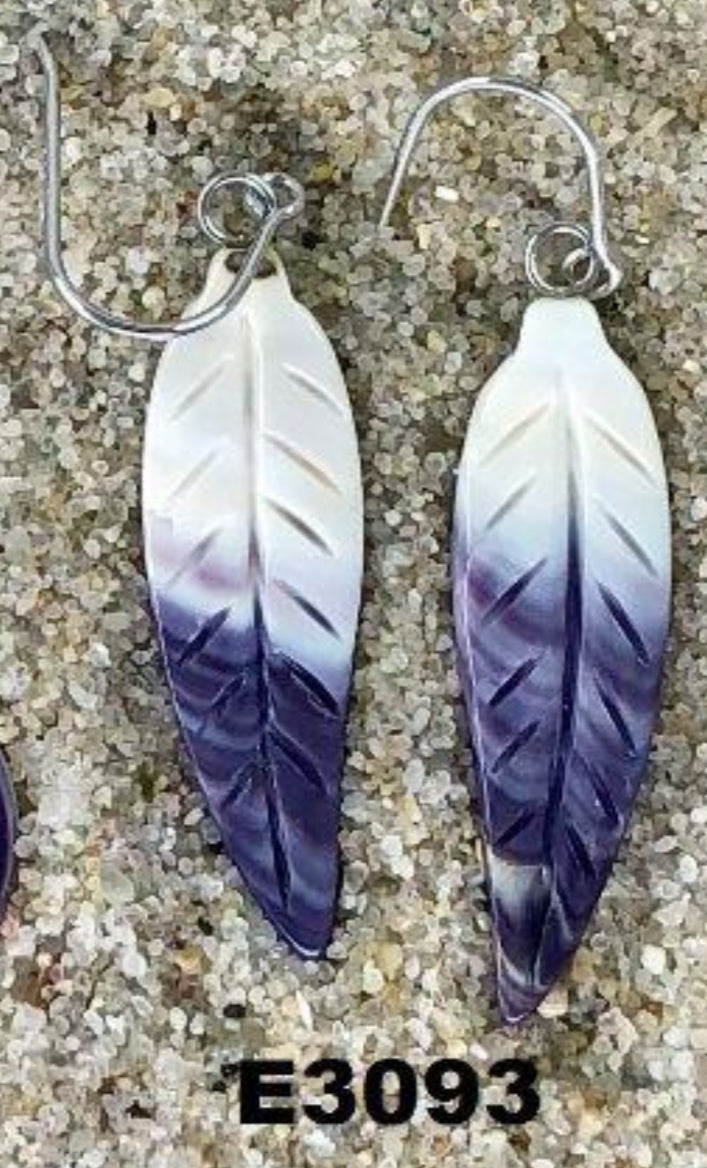 E3093 Curved Feather Wampum Natural Earrings Sterling Silver